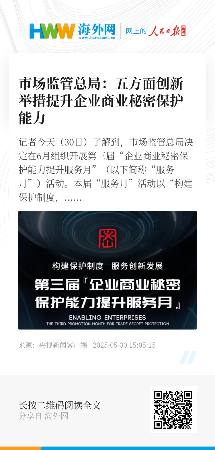 记者今天(30日)了解到,市场监管总局决定在6月组织开展第三届“企业商业秘密保护能力提升服务月”(以下简称“服务月”)活动。