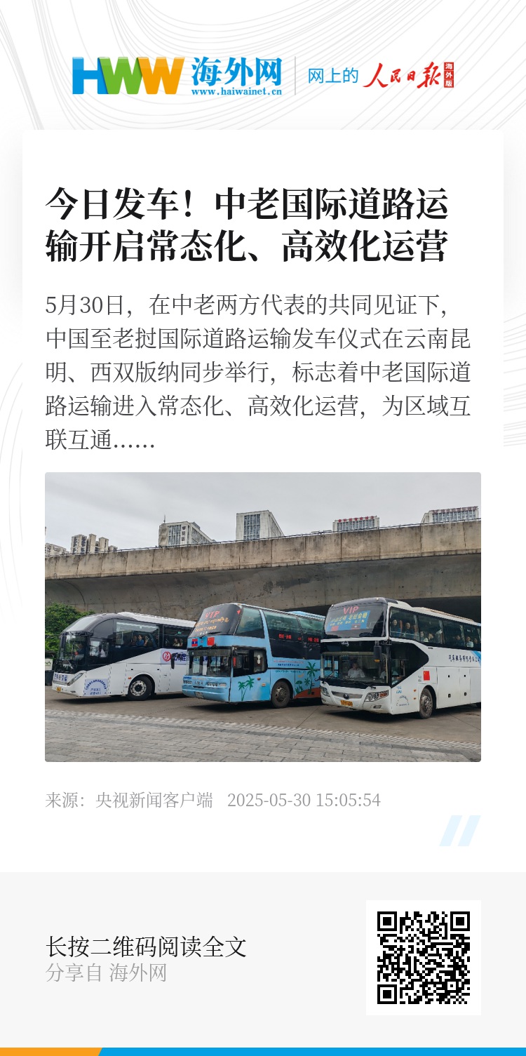 5月30日,在中老两方代表的共同见证下,中国至老挝国际道路运输发车仪式在云南昆明、西双版纳同步举行,标志着中老国际道路运输进入常态化、高效化运营,为区域互联互通和经贸发展注入强劲动能。