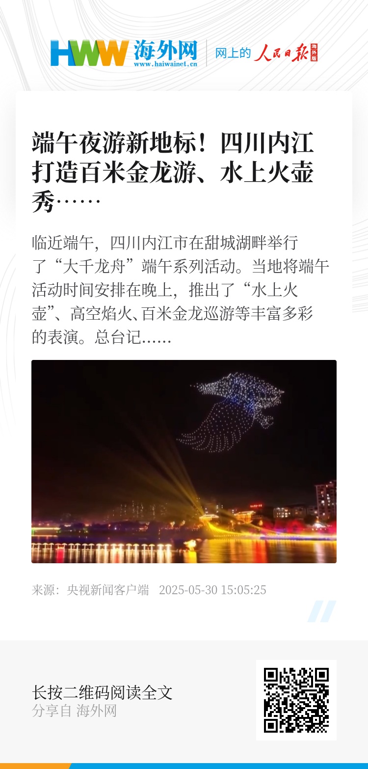 总台记者 赵雄:我现在是在四川内江的甜城湖畔,此时此刻进行的就是今年端午节的夜间水上活动。在现场我们可以看到一条130米长的金色长龙在湖面上缓慢地游荡。