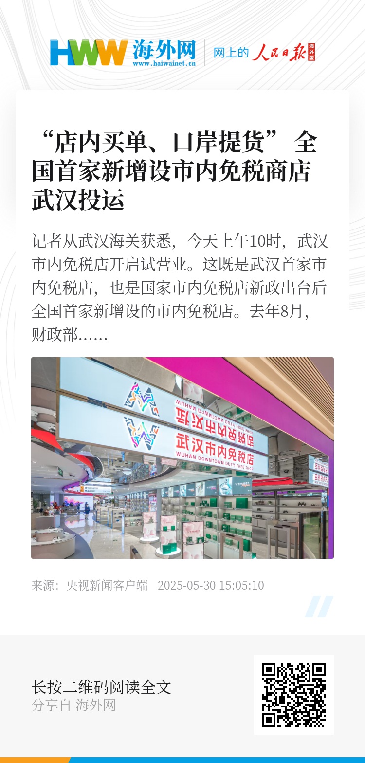 记者从武汉海关获悉,今天上午10时,武汉市内免税店开启试营业。这既是武汉首家市内免税店,也是国家市内免税店新政出台后全国首家新增设的市内免税店。