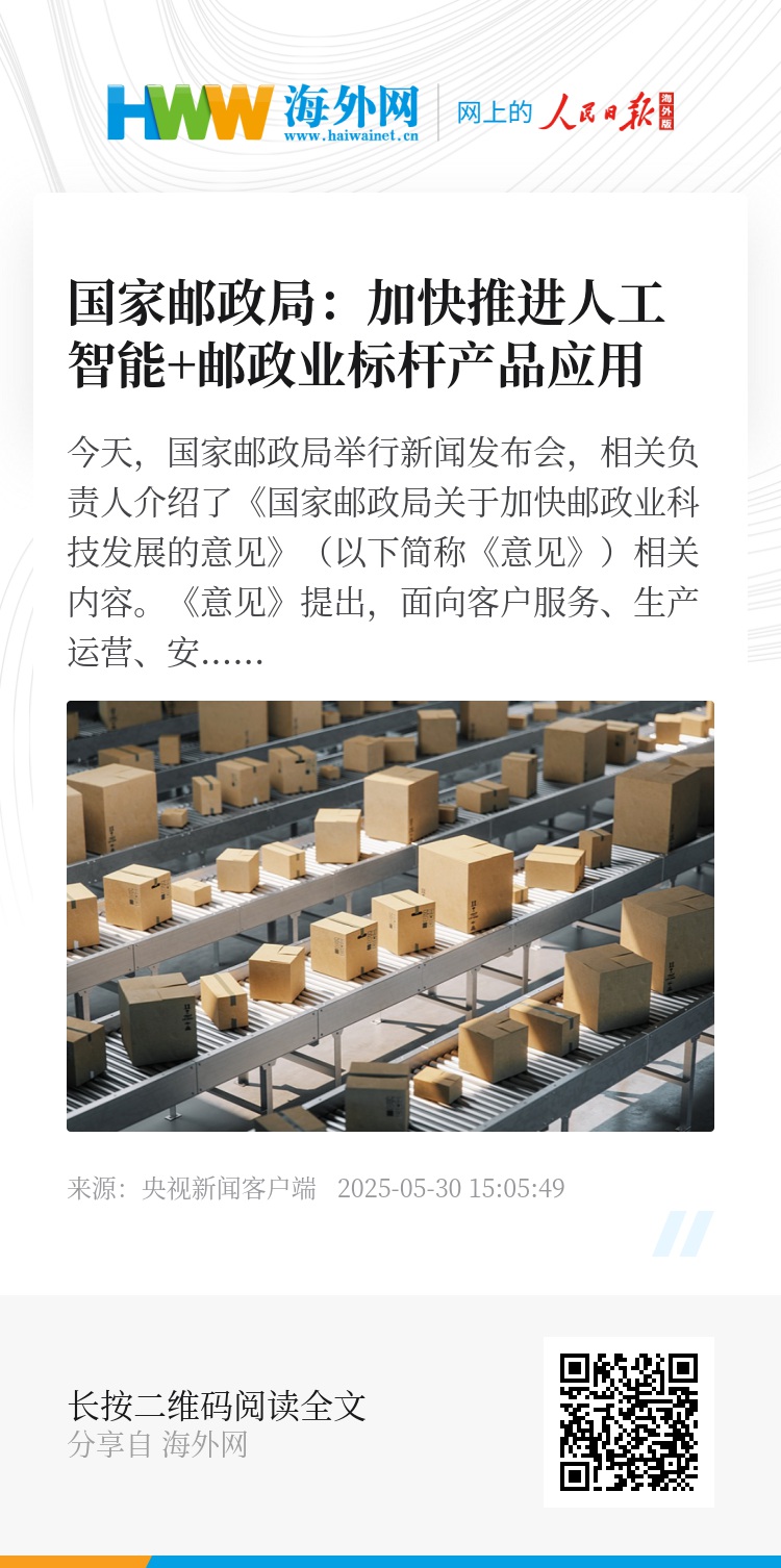 《意见》提出,面向客户服务、生产运营、安全管理等应用场景,要打造人工智能+邮政业标杆产品。目前,我国人工智能技术在邮件快件收寄、分拣、运输、投递等环节都得到了积极应用。如邮政业智能安检系统大幅提升安检效率、降低成本,有力推动了邮件快件安全检查制度落实。
