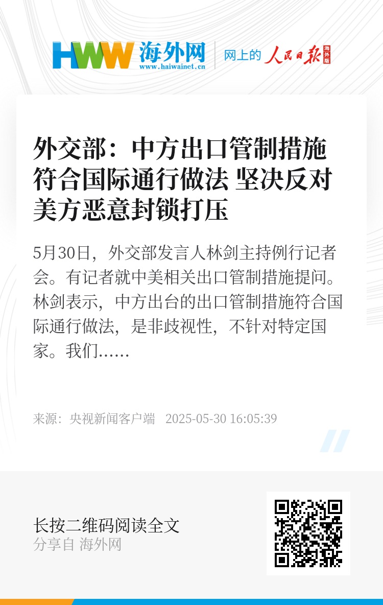林剑表示,中方出台的出口管制措施符合国际通行做法,是非歧视性,不针对特定国家。我们愿与有关国家和地区加强出口管制领域对话合作,致力于维护全球产供链稳定,美方的有关做法是在泛化国家安全概念,将经贸科技问题政治化、工具化,对中国进行恶意封锁和打压,我们对此坚决反对,并将坚决维护自身的正当权益。