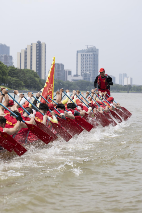 “下水!起桨!”广东东莞万江街道龙舟划手黄柱良有着20多年“龙舟龄”,长期在国内外比赛。为了近日在东江江面举行的龙舟趁景活动,他和伙伴们足足准备了1个多星期。