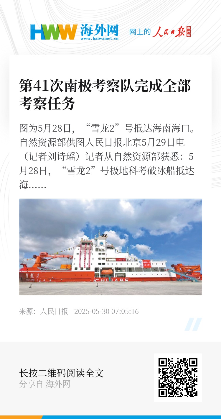 人民日报北京5月29日电(记者刘诗瑶)记者从自然资源部获悉:5月28日,“雪龙2”号极地科考破冰船抵达海南海口,标志着中国第41次南极考察队顺利完成全部考察任务。“雪龙2”号于2024年11月1日从广州出发,历时208天,总航程4万余海里。