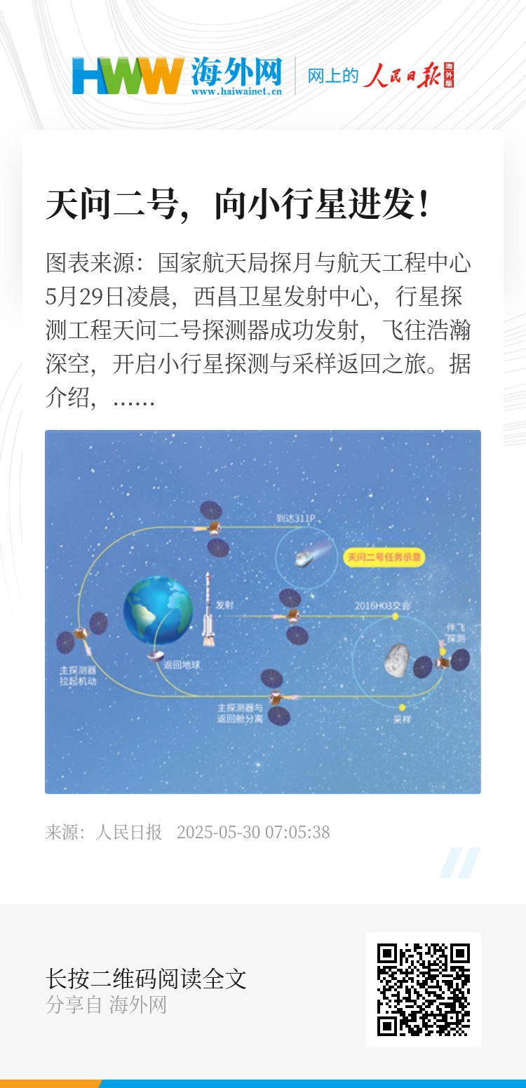 5月29日凌晨,西昌卫星发射中心,行星探测工程天问二号探测器成功发射,飞往浩瀚深空,开启小行星探测与采样返回之旅。