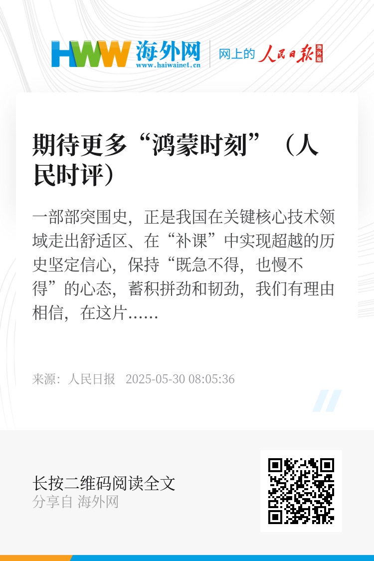 还要看到,实现自主可控、自立自强绝非一朝一夕之功,而是一个长期过程。我们在不少领域起步晚、底子薄,但只要明确方向、扬长避短、激发潜力,后发也可先至。从基础研究到前沿技术,从国家谋划到企业自觉,从昔日短板到今日成势,创新已深深植根于中国大地、深深融入中国人的血脉之中。坚定信心,保持“既急不得,也慢不得”的心态,蓄积拼劲和韧劲,我们有理由相信,在这片创新的热土上,将出现更多的“鸿蒙时刻”,也将上演更多从追赶到超越的逆袭故事。(谷业凯)