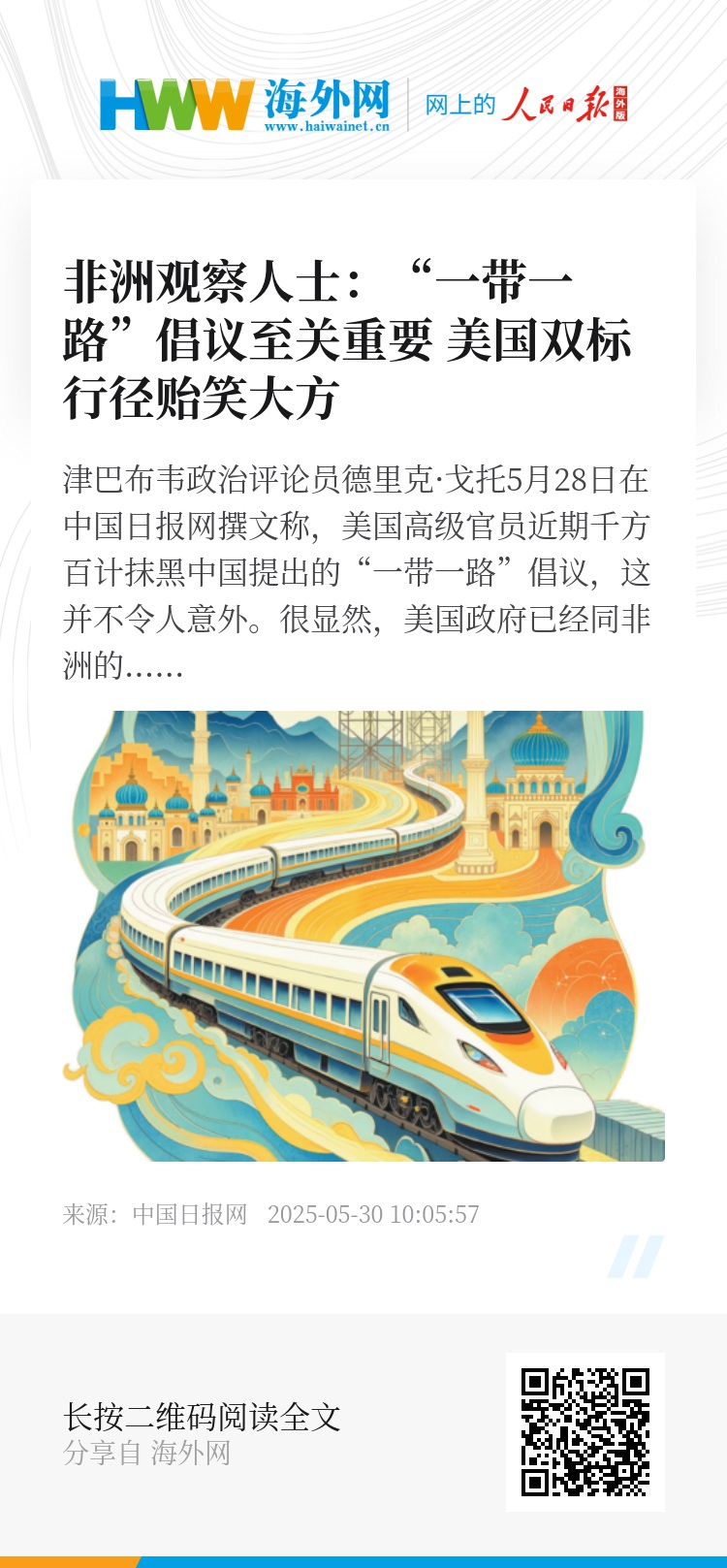 文章最后强调,披着“外交”外衣对外施压的时代已经结束。非洲不是欧美的“后院”,而是多极世界的重要一极。在这片大陆上,“一带一路”倡议并非外来威胁,而是生命线。
