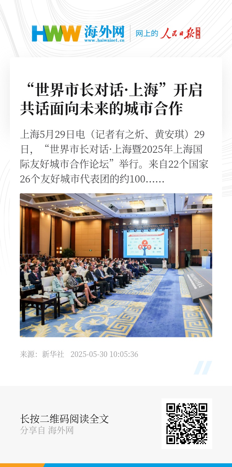 作为全球交流合作的重要平台,“世界市长对话”旨在增进国际互信友谊、深化互学互鉴,对推动构建人类命运共同体具有重要意义。