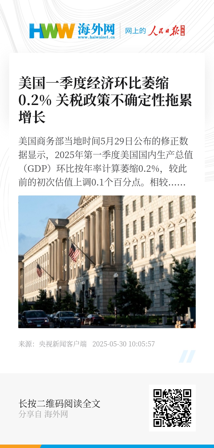 美国商务部当地时间5月29日公布的修正数据显示,2025年第一季度美国国内生产总值(GDP)环比按年率计算萎缩0.2%,较此前的初次估值上调0.1个百分点。