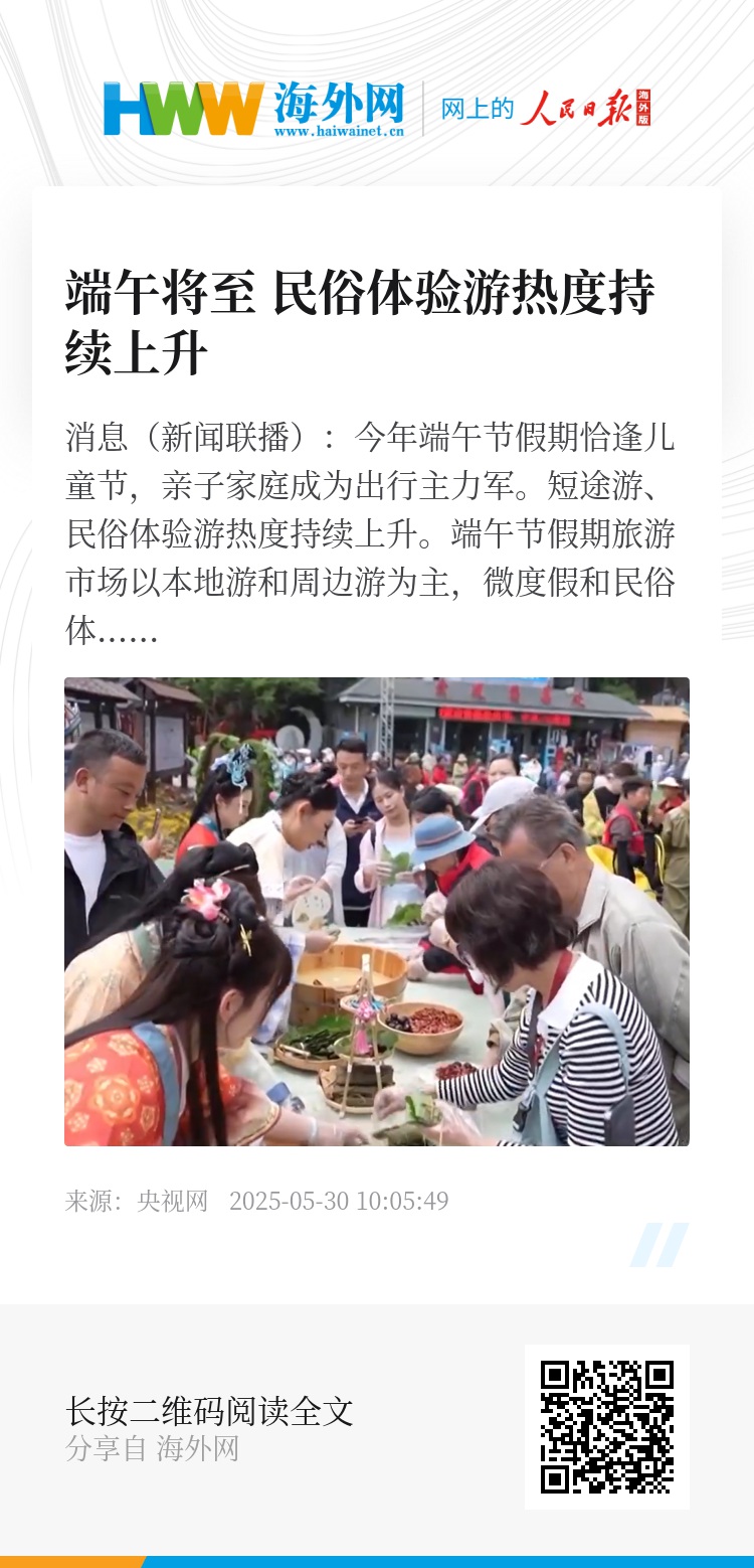 央视网消息(新闻联播):今年端午节假期恰逢儿童节,亲子家庭成为出行主力军。短途游、民俗体验游热度持续上升。