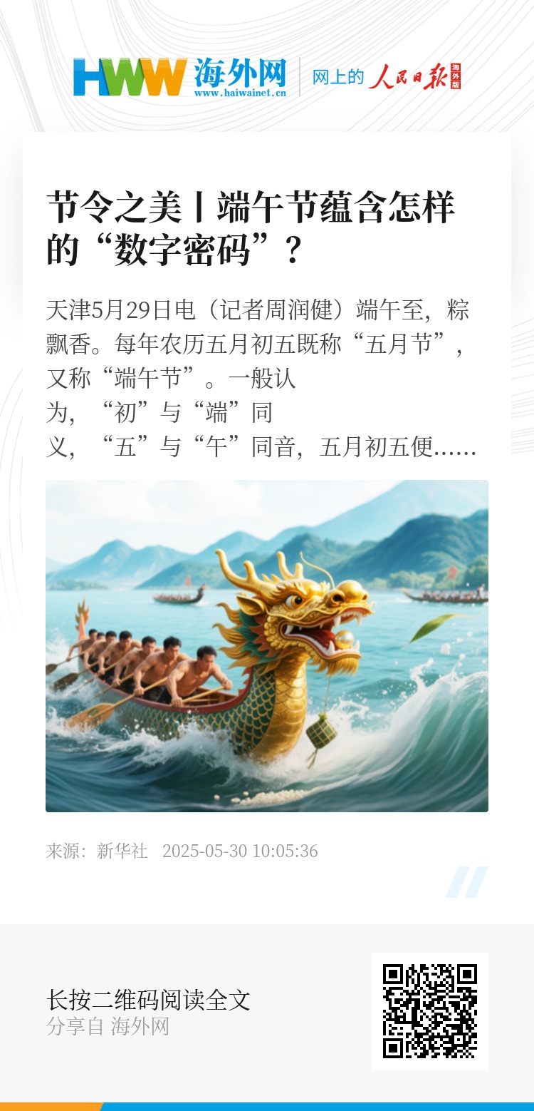 新华社天津5月29日电(记者周润健)端午至,粽飘香。每年农历五月初五既称“五月节”,又称“端午节”。一般认为,“初”与“端”同义,“五”与“午”同音,五月初五便被称作端午。那么,为什么要选择五月初五这个“重日”作为节日?其中蕴含着怎样的“数字密码”?