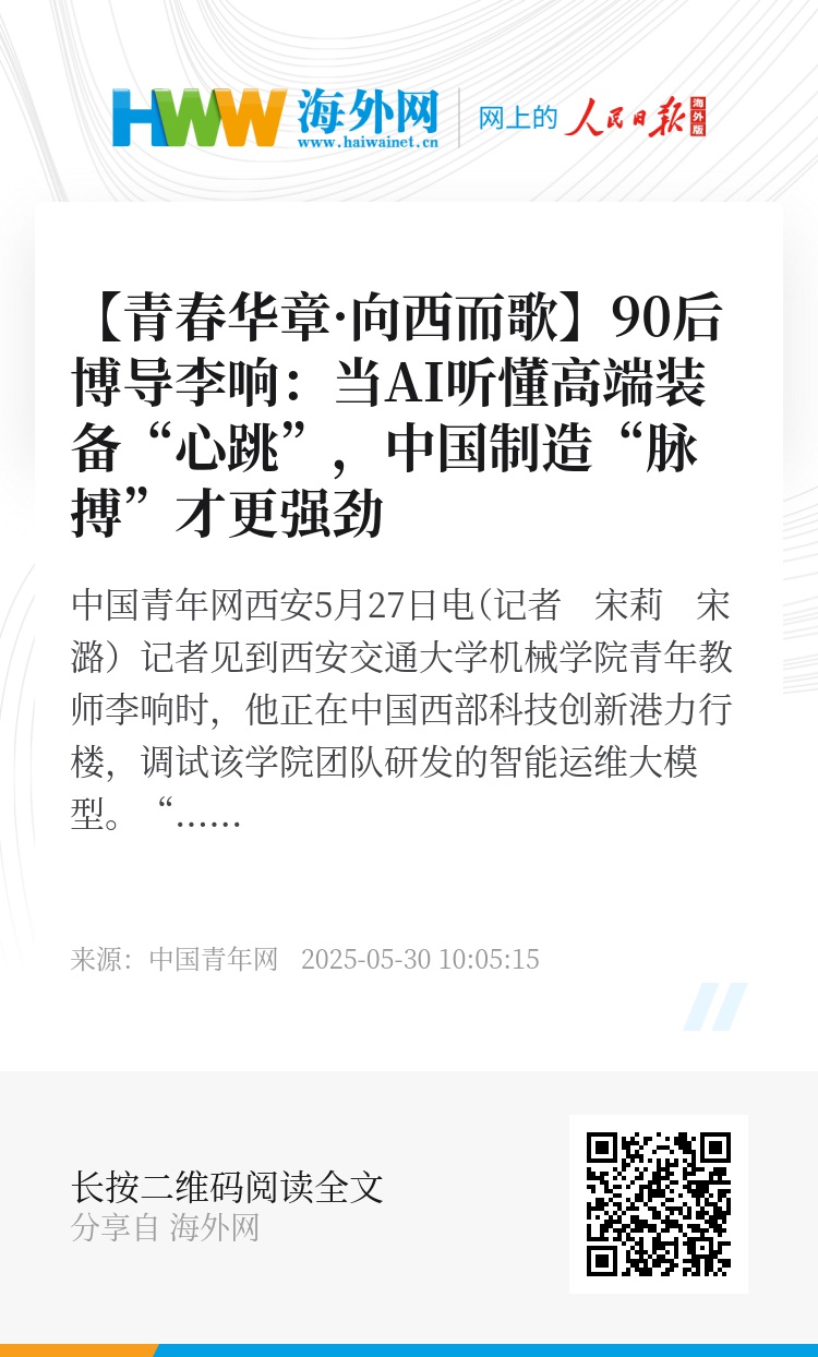 中国青年网西安5月27日电(记者 宋莉 宋潞)记者见到西安交通大学机械学院青年教师李响时,他正在中国西部科技创新港力行楼,调试该学院团队研发的智能运维大模型。“这款大模型如果构建成功,将广泛应用于多类型高端装备。”这位90后博导,对这款大模型尽快落地应用充满信心,期待着它为国家重大装备的安全运行提供坚实保障。
