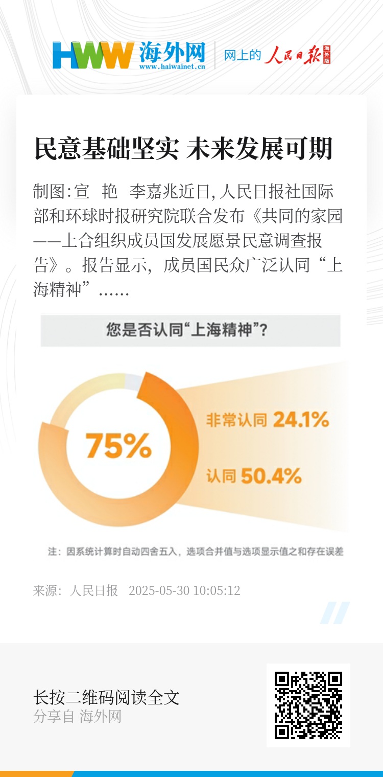 近日,人民日报社国际部和环球时报研究院联合发布《共同的家园——上合组织成员国发展愿景民意调查报告》。报告显示,成员国民众广泛认同“上海精神”及“五个共同家园”重要倡议,肯定上海合作组织在全球治理等方面发挥的积极作用,多数受访者认为中国发展经验值得其他上合组织国家借鉴,对深化国家间各领域合作充满期待。