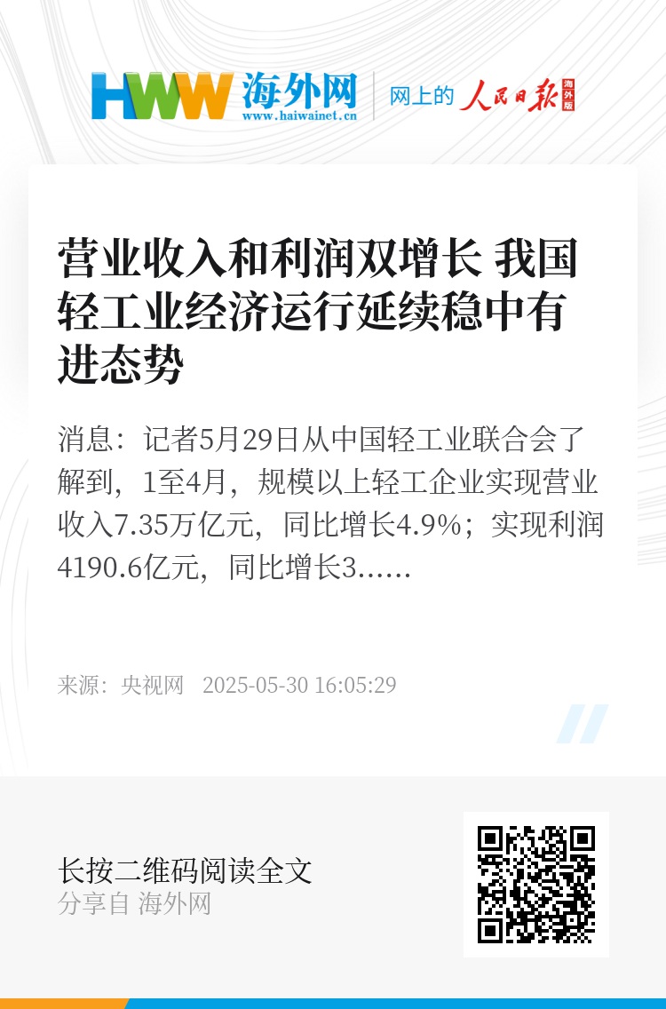 央视网消息:记者5月29日从中国轻工业联合会了解到,1至4月,规模以上轻工企业实现营业收入7.35万亿元,同比增长4.9%;实现利润4190.6亿元,同比增长3.8%。在系列扩内需、促消费政策支持下,轻工业经济运行延续稳中有进态势。消费品以旧换新政策加力扩围效果明显,有效促进轻工相关产业规模扩大,带动轻工业经济增长。数据显示,1至4月,有超过3400万名消费者参加了家电产品以旧换新,累计购买的12类家电产品超过5100万台,带动销售1745亿元。