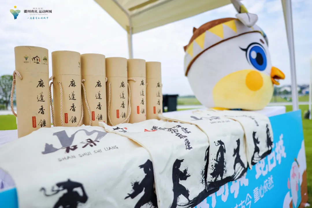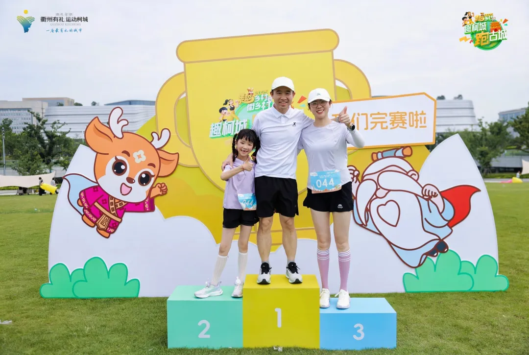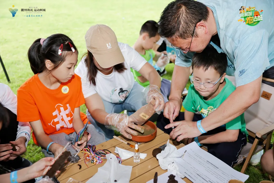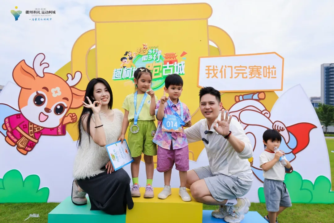 冲过终点线,精彩才过了一半。在衢州市民公园,由柯城区十八个乡镇街道联合打造的“趣柯城·村游会”热闹开市。在石梁镇麻蓬村“搞个‘锤子’吧”摊位上,孩子们学习中草药知识,在制作麻蓬香锤的过程中不亦乐乎;石室乡荆溪村开设了“荆溪‘棋’妙会”展位,大棋盘投掷游戏吸引全家齐上阵;沟溪乡余东村的农民画长卷前,亲子共绘美好心愿……完成任务的家庭还可兑换由柯城特色米酒、竹编工艺品、卡通香囊等组成的“趣乡村文创礼包”。“我抱着孩子奔跑,被周围的气氛感染,都感觉不到累。沿途各点位不仅有传统特色展示,还设有拍照打卡点,每一处都很有意义。结束比赛还能体验这么多乡村特色活动,满载而归。”全省文明家庭获得者林晓剑在完赛后,带着孩子领取亲子套装奖牌和可抽拉南孔爷爷矿泉水,并在终点拍摄了全家福。