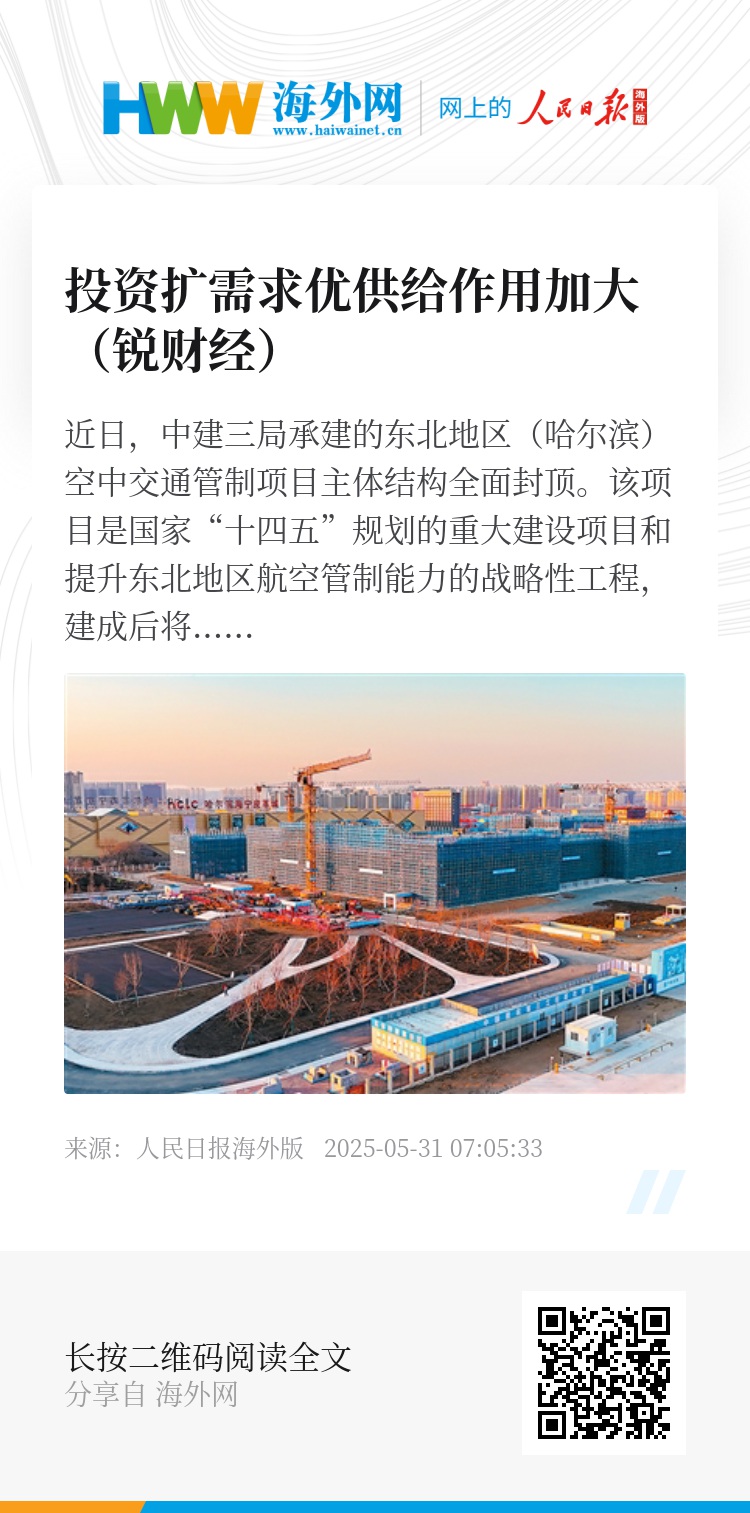 近日,中建三局承建的东北地区(哈尔滨)空中交通管制项目主体结构全面封顶。该项目是国家“十四五”规划的重大建设项目和提升东北地区航空管制能力的战略性工程,建成后将成为民航空中交通服务的重要基础,为民航安全高效运行提供支撑。黄成铭摄(人民视觉)