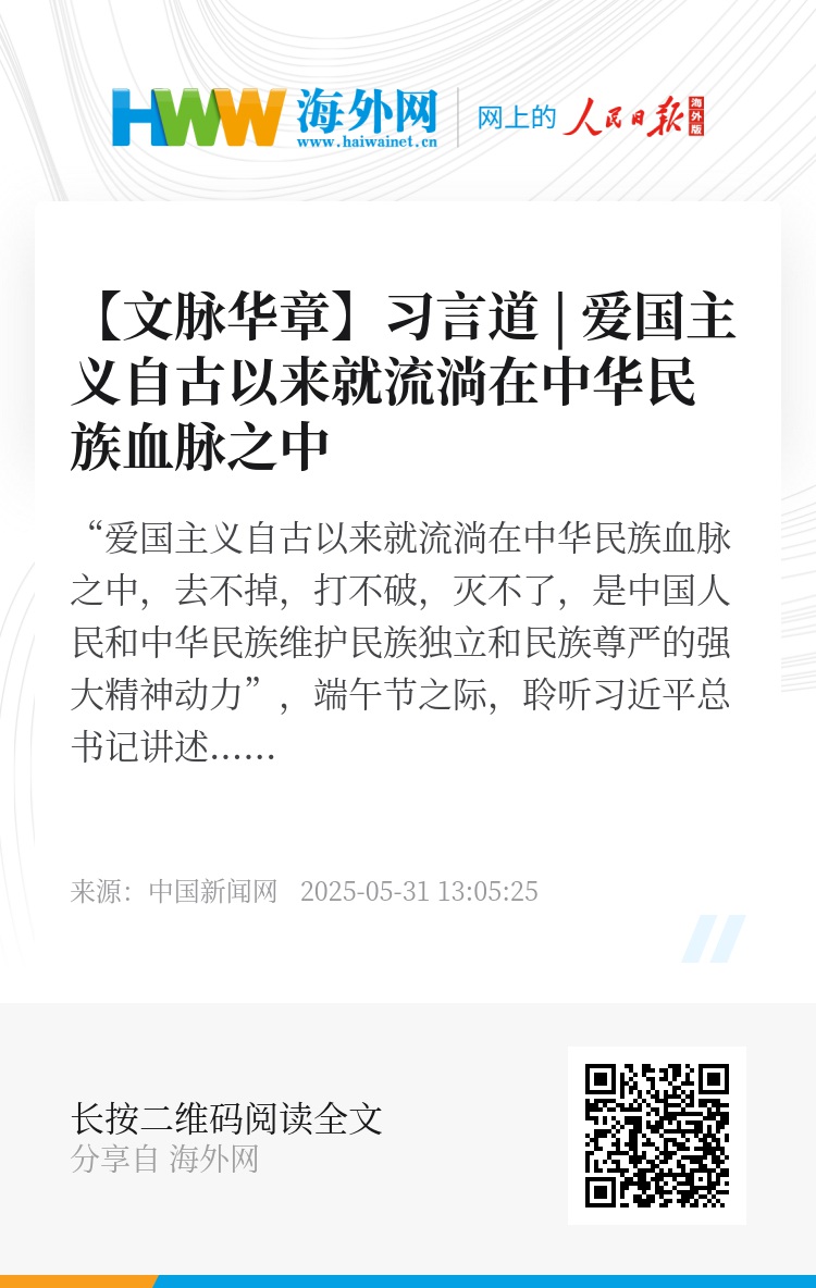“爱国主义自古以来就流淌在中华民族血脉之中,去不掉,打不破,灭不了,是中国人民和中华民族维护民族独立和民族尊严的强大精神动力”,端午节之际,聆听习近平总书记讲述至真至深的家国情怀。