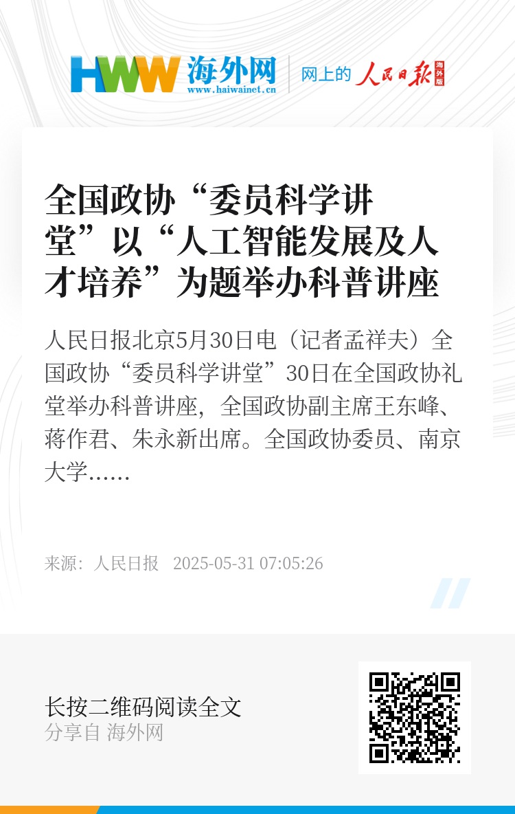 人民日报北京5月30日电(记者孟祥夫)全国政协“委员科学讲堂”30日在全国政协礼堂举办科普讲座,全国政协副主席王东峰、蒋作君、朱永新出席。