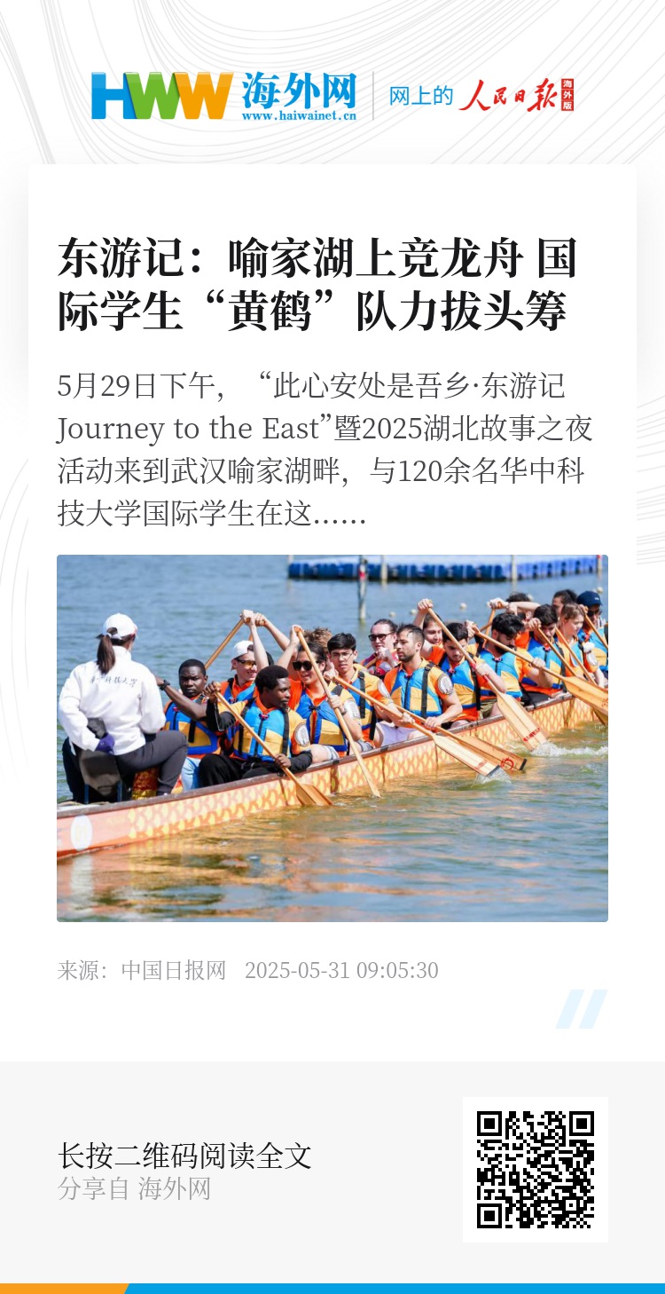 5月29日下午,“此心安处是吾乡·东游记Journey to the East”暨2025湖北故事之夜活动来到武汉喻家湖畔,与120余名华中科技大学国际学生在这里上演了一场别开生面的国际学生龙舟友谊赛事。本次友谊赛共有六支队伍参加,分别以琴台、木兰、黄鹤、编钟等武汉文化元素命名。