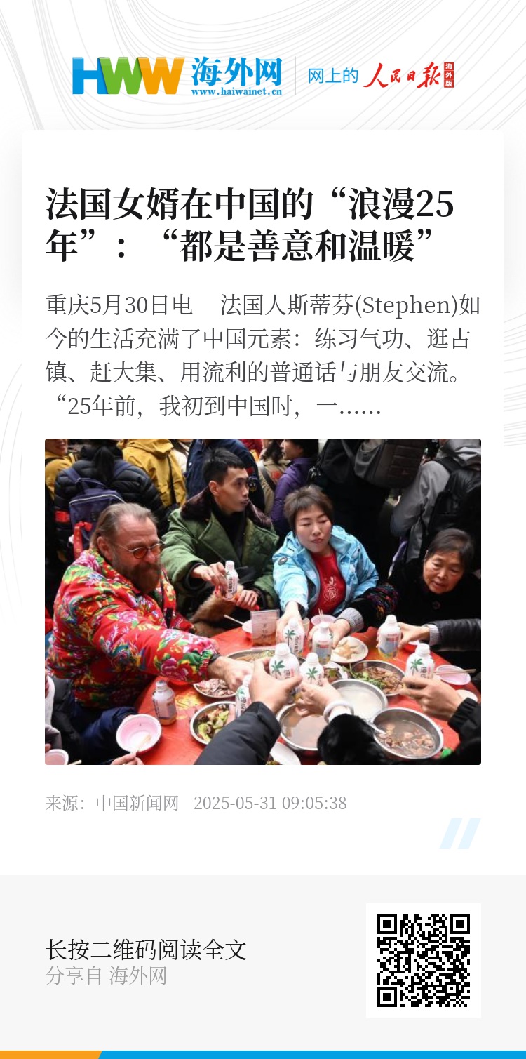 从“没问题”“吃饭了吗”等日常用语学起,斯蒂芬的中文突飞猛进,如今能用普通话流利交流,还略懂南京话、上海话和重庆话。“这里的每个人都是我的语言老师。”他说,25年来,他大部分时间都在中国,每年仅回乡探亲一个月。他的母亲也曾来这里小住数月,且深深喜爱在中国的生活。