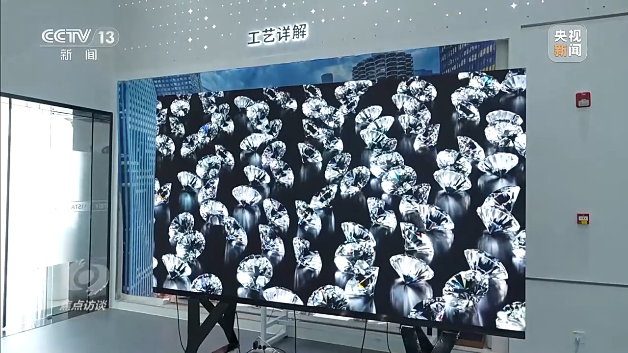 维信诺Micro-LED技术负责人、成都辰显光电有限公司总经理 黄秀颀:这款产品历经了8年的研发时间,到现在推出全球最新的135英寸TFT基Micro-LED(显示屏)。它的特点,亮度非常高,而且色彩非常细腻,还原度很高。但是这块屏是拼接出来的,上面总共有2400万颗LED发光点,大的135英寸里面有200片屏,每个屏还要把它组装成箱体,这里有25个箱体。可以根据客户的需求定制大小,只要把箱体拼上去就可以无限扩展,现在拼缝控制的是几十个微米量级,大概就是头发丝直径的五分之一。