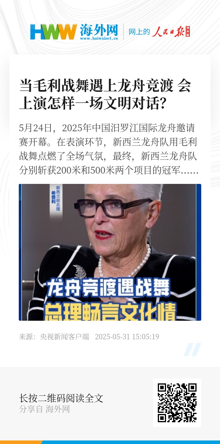 5月24日,2025年中国汨罗江国际龙舟邀请赛开幕。在表演环节,新西兰龙舟队用毛利战舞点燃了全场气氛,最终,新西兰龙舟队分别斩获200米和500米两个项目的冠军,载誉而归。他们表示,这场比赛是一次心灵的连接和文化的对话,希望中新两国友谊长存。