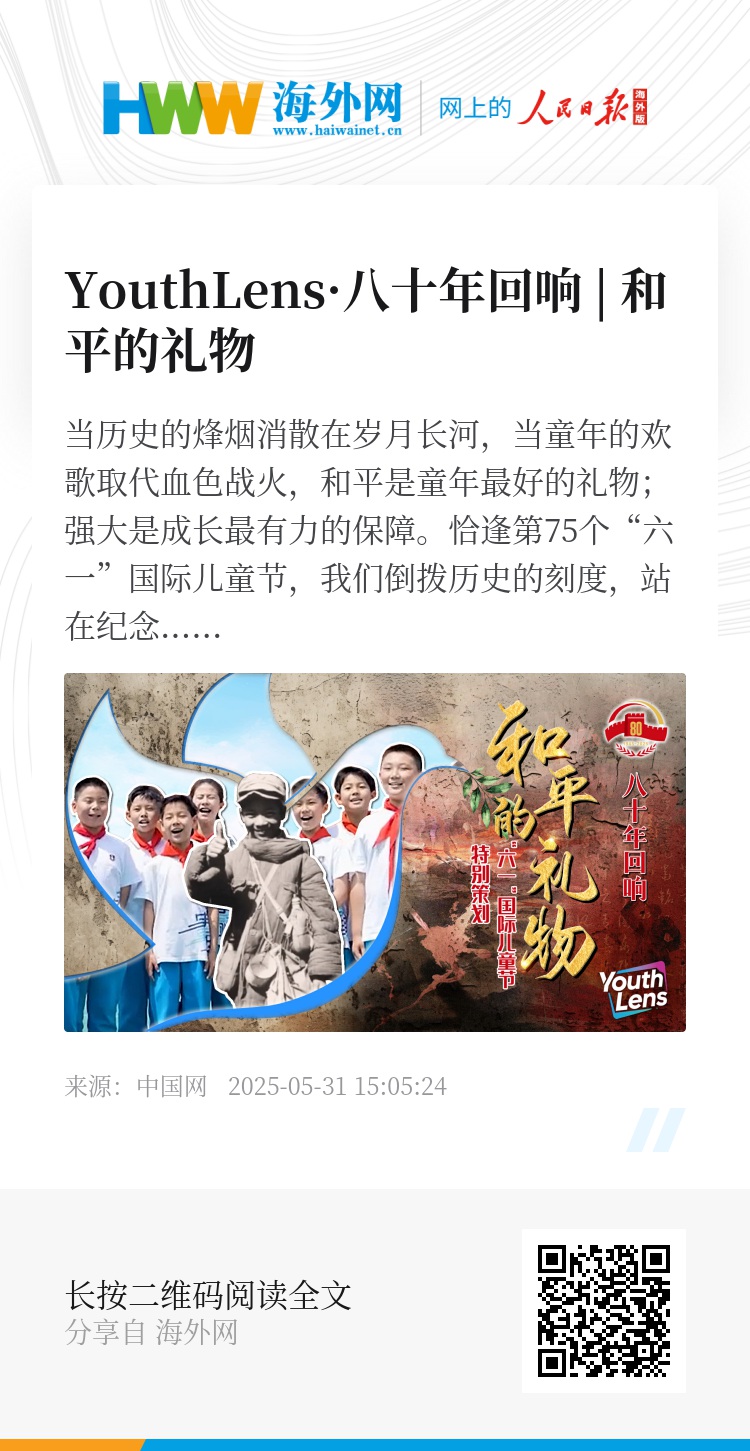 本期《Youth Lens·八十年回响》“六一”国际儿童节特辑,让我们一起翻开鲜血浸透的日历,亲手触摸文明的伤痕。因为真正的纪念不是复述苦难,而是让每双眼睛都看见,那些沉没在历史冰河里的星光,终将托起新生的太阳——和平是永恒的礼物。