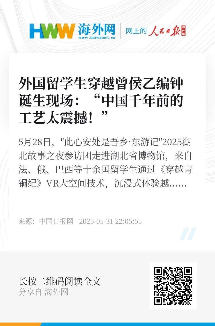 5月28日,"此心安处是吾乡·东游记"2025湖北故事之夜参访团走进湖北省博物馆,来自法、俄、巴西等十余国留学生通过《穿越青铜纪》VR大空间技术,沉浸式体验越王勾践剑铸造、曾侯乙编钟诞生等历史场景。萨摩亚留学生赞叹:"中国千年前的工艺令人震撼!"新西兰留学生直言VR技术让不感兴趣的历史变得生动。(记者:于涵 编辑:许聃 刘世东)
