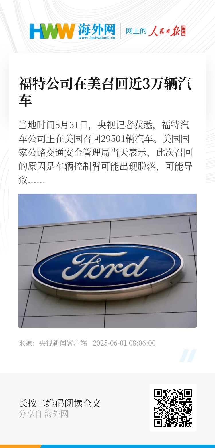当地时间5月31日,央视记者获悉,福特汽车公司正在美国召回29501辆汽车。