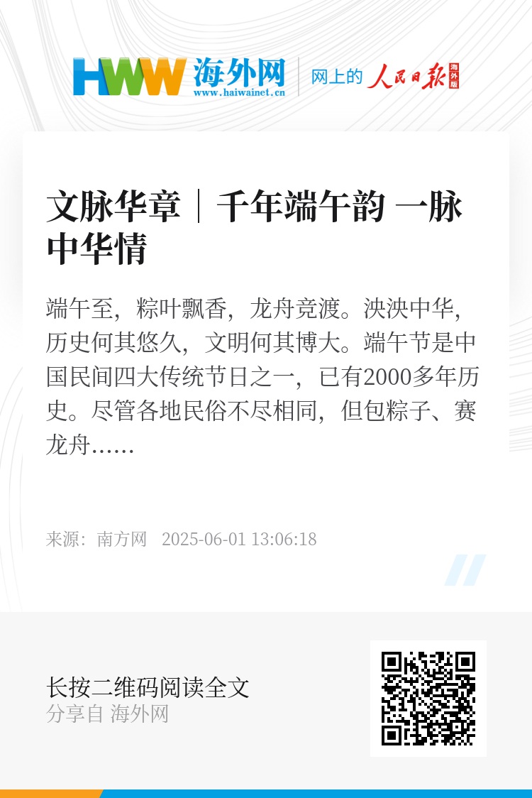 泱泱中华,历史何其悠久,文明何其博大。端午节是中国民间四大传统节日之一,已有2000多年历史。尽管各地民俗不尽相同,但包粽子、赛龙舟、挂艾草、系五彩绳等浸润着中华文明基因的独特节庆仪式,屈原笔下“路漫漫其修远兮,吾将上下而求索”等脍炙人口的诗句,构成了中华儿女对端午节的共同文化记忆,成为增强中华民族凝聚力的文化纽带。