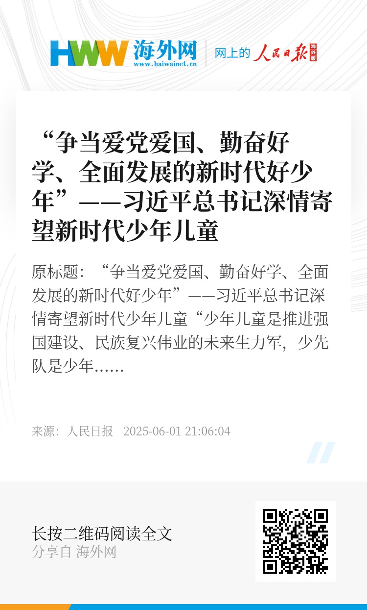 寄语“注意培养追求真理、报效祖国的志向”;强调“新时代中国儿童应该是有志向、有梦想,爱学习、爱劳动,懂感恩、懂友善,敢创新、敢奋斗,德智体美劳全面发展的好儿童”;嘱咐“有梦想,还要脚踏实地,好好读书,才能梦想成真”……深情嘱托、悉心教导,指引孩子们“努力成长为堪当强国建设、民族复兴大任的栋梁之材”。