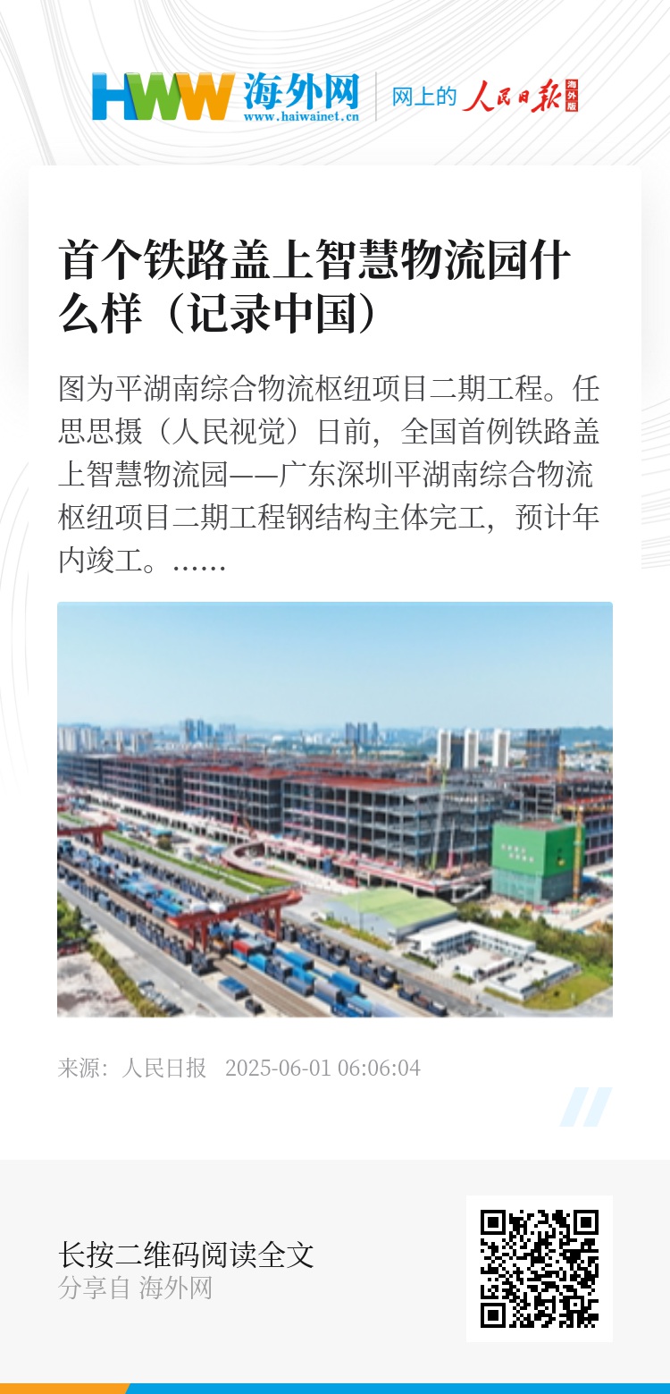 日前,全国首例铁路盖上智慧物流园——广东深圳平湖南综合物流枢纽项目二期工程钢结构主体完工,预计年内竣工。