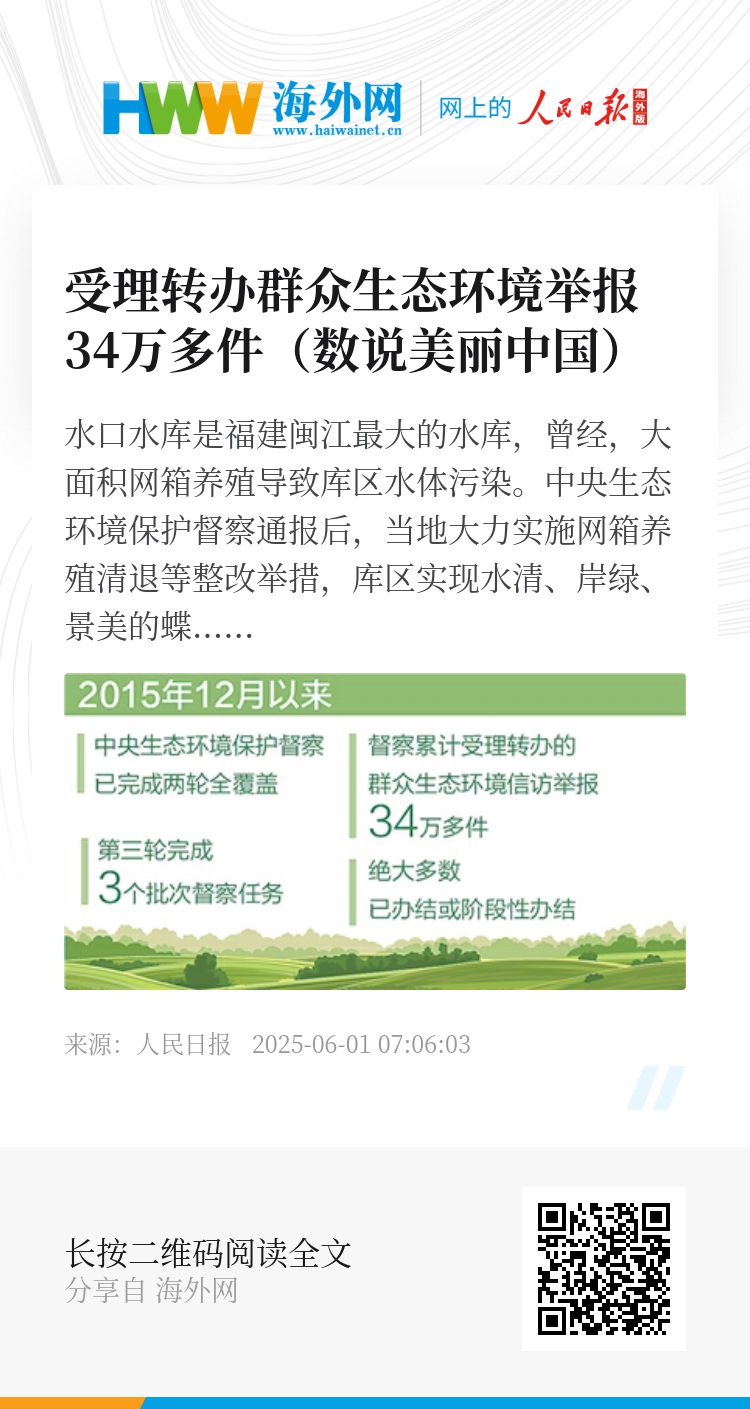 截至目前,督察累计受理转办的群众生态环境信访举报34万多件,绝大多数已办结或阶段性办结,坚决查处一批破坏生态环境的重大典型案件、解决一批人民群众反映强烈的突出生态环境问题。
