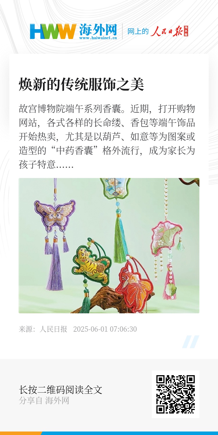 近期,打开购物网站,各式各样的长命缕、香包等端午饰品开始热卖,尤其是以葫芦、如意等为图案或造型的“中药香囊”格外流行,成为家长为孩子特意准备的节日礼物。端午服饰之美,在当代生活语境中不断焕新。