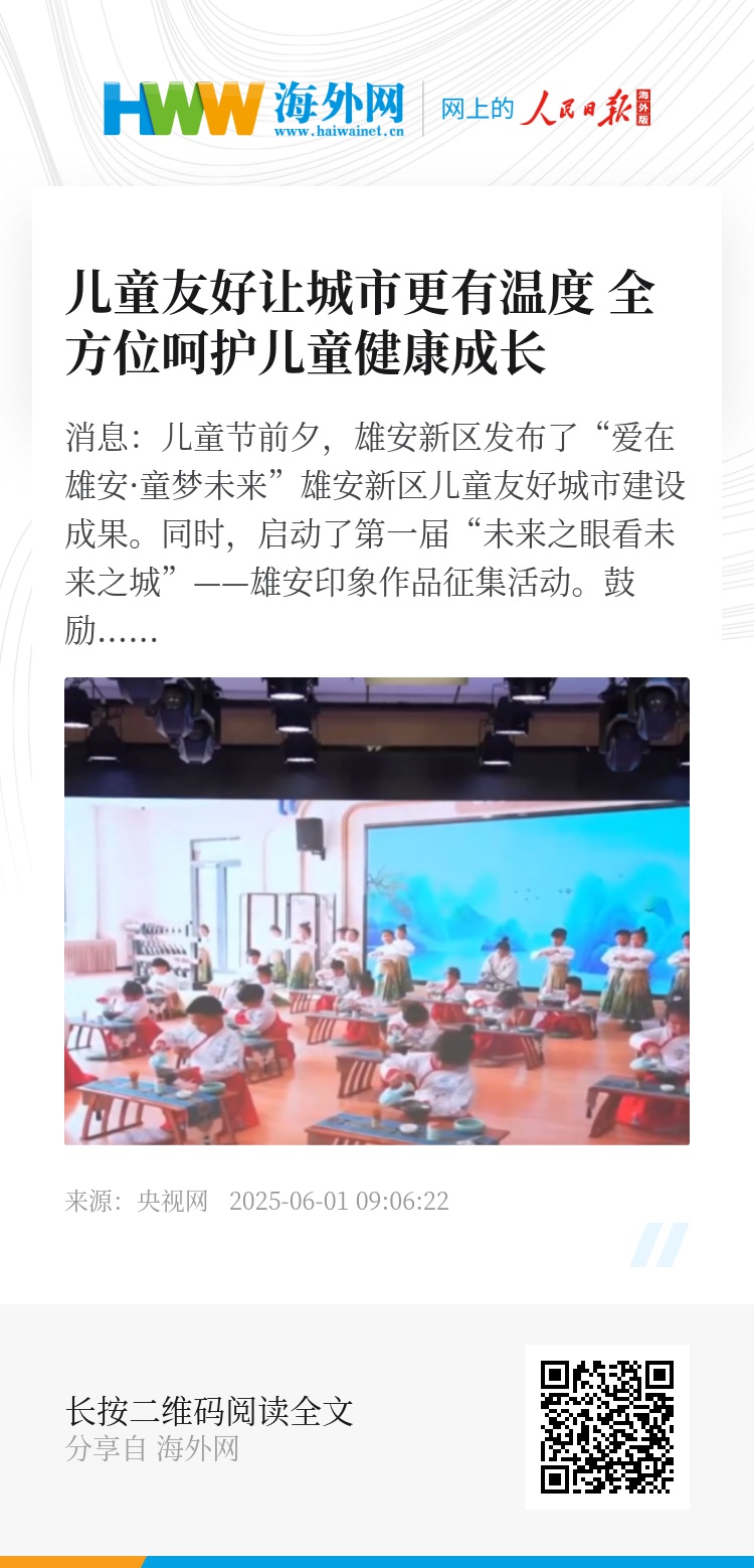 央视网消息:儿童节前夕,雄安新区发布了“爱在雄安·童梦未来”雄安新区儿童友好城市建设成果。同时,启动了第一届“未来之眼看未来之城”——雄安印象作品征集活动。鼓励孩子们通过摄影、绘画等形式记录和畅想雄安。活动现场还发布了儿童友好城市宣传片(2025版)、第二批儿童友好公益践学地图。