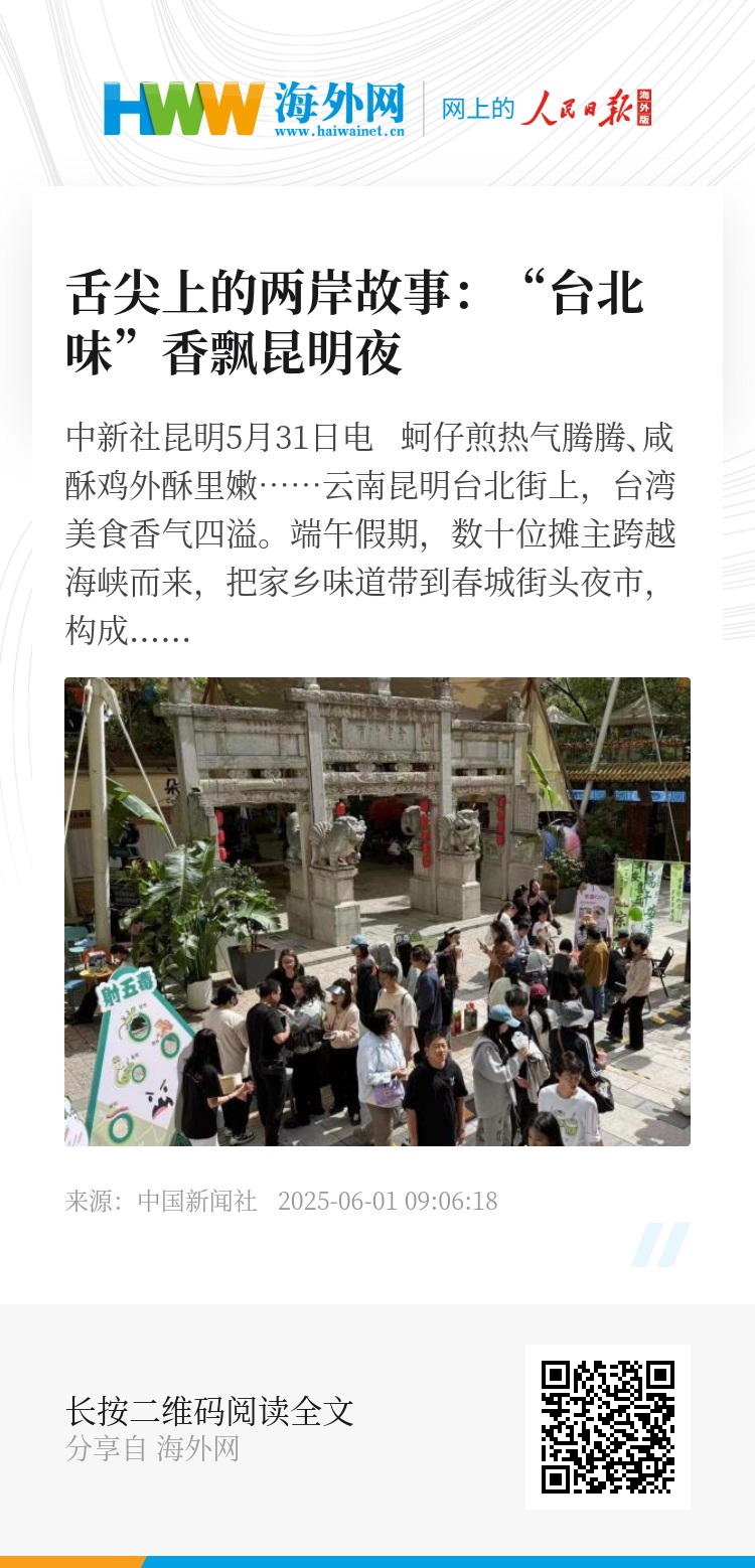 中新社昆明5月31日电 蚵仔煎热气腾腾、咸酥鸡外酥里嫩……云南昆明台北街上,台湾美食香气四溢。端午假期,数十位摊主跨越海峡而来,把家乡味道带到春城街头夜市,构成一道独特风景线。