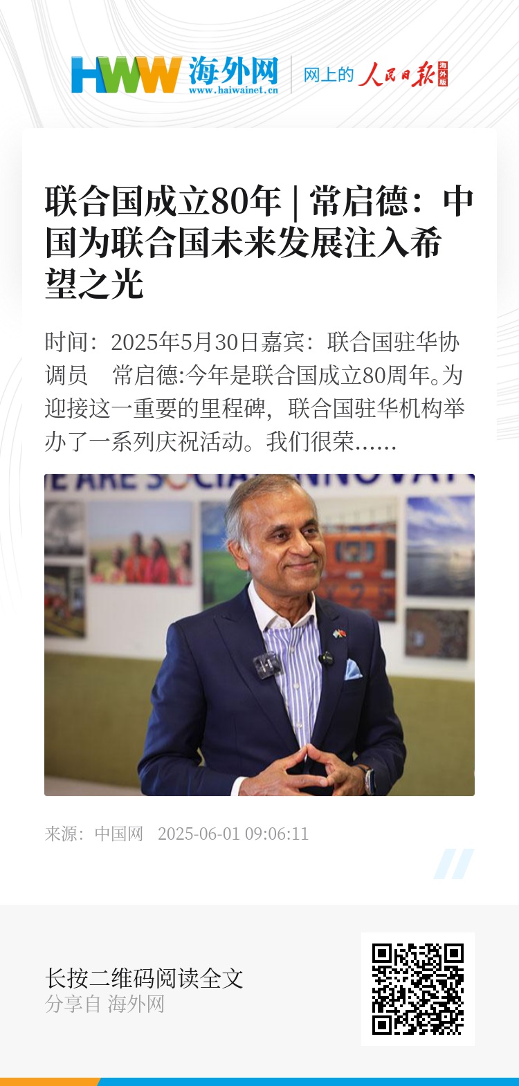 作为联合国驻华协调员,今天(5月17日)我和大家一起庆祝联合国家庭日。所有联合国驻华机构,包括26家联合国下属基金、项目和专门机构,都参与其中。各机构负责人、工作人员及其家属悉数到场,共同纪念联合国成立80周年这一重要里程碑。尽管当前挑战重重,但我们决不能丧失希望,必须满怀希望。在我看来,中国这样的国家,为我们注入了希望之光。