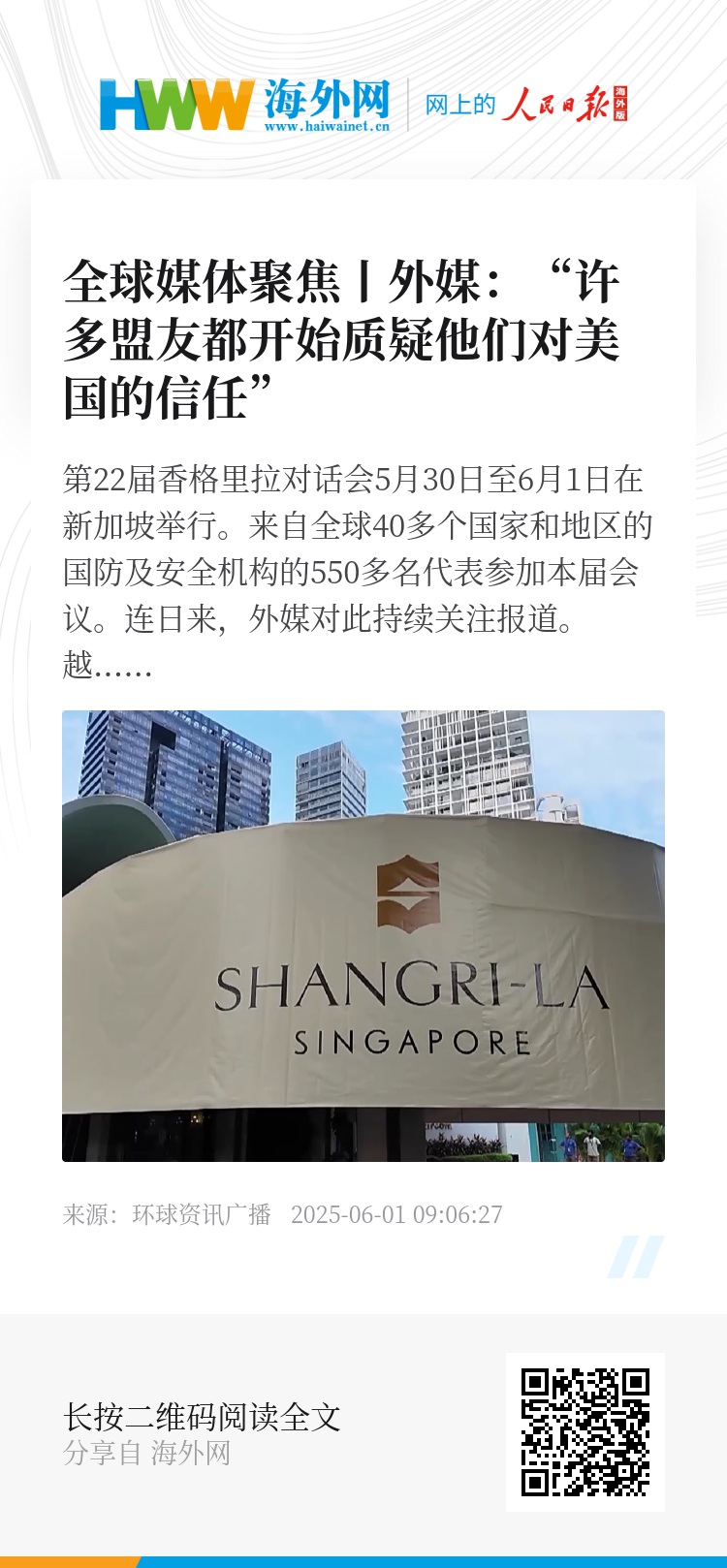 《华盛顿邮报》报道说,在本届香格里拉对话会上,美国国防部长赫格塞思试图向与会的地区防务官员及外交人士保证“美国仍是可靠信赖的合作伙伴”,然而,鉴于美国发动了一场庞大的贸易战,这促使其许多盟友都开始质疑他们对美国的信任。当前美国政府的政策正在将全球政治格局推向危险的方向。