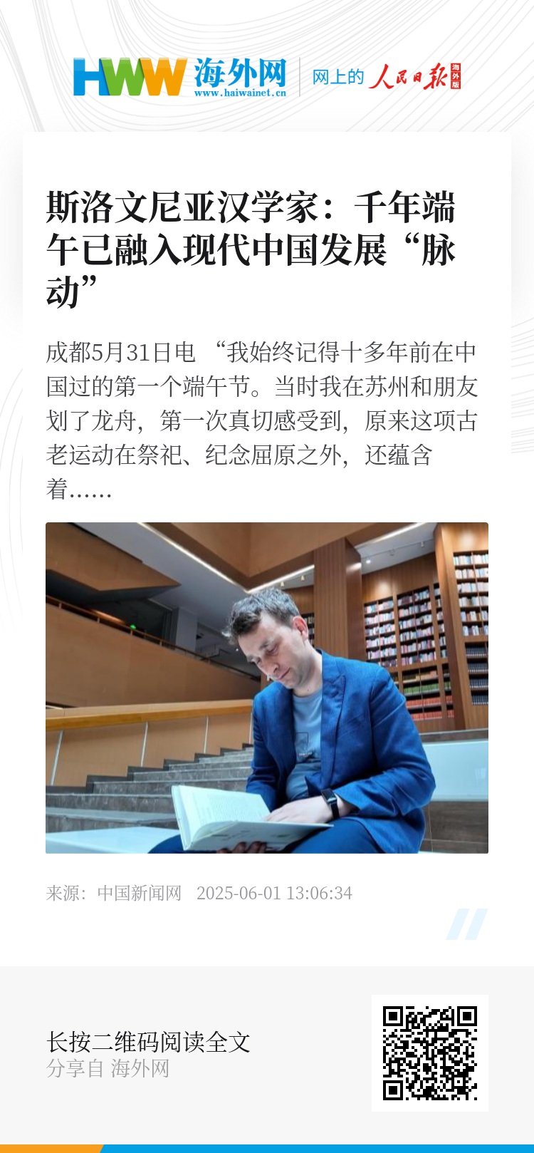 司马文斐接受中新网记者专访时表示,尽管他在儿时就知晓了中国端午节,但在中国生活的每一年,都更新着他对这个古老节日的认知——有着数千年历史的端午节从不只存在于文献中,更融入了现代中国的发展“脉动”。
