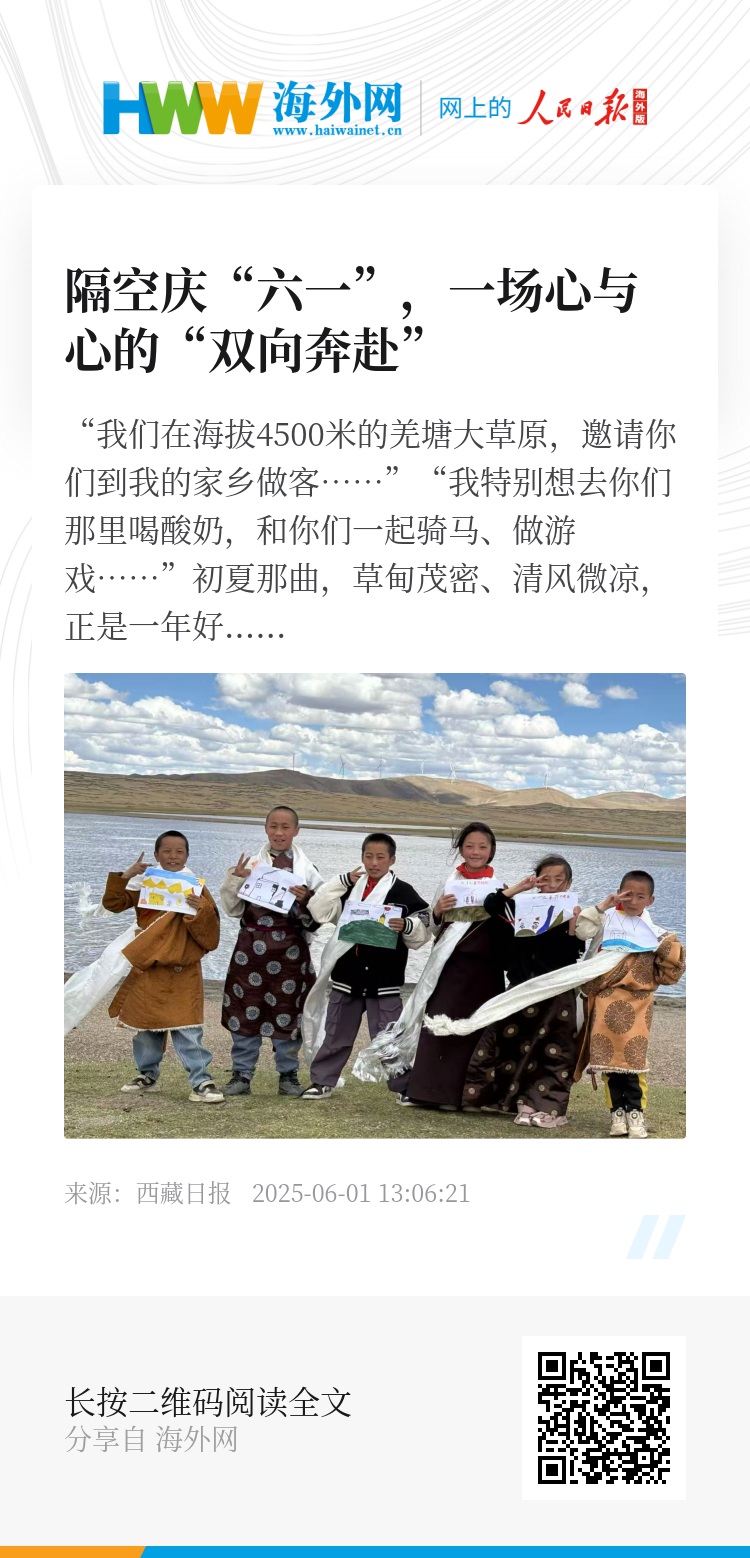 当来自北京的祝福传回羌塘大草原,孩子们兴奋地蹦啊跳啊,手中洁白的哈达被高高举起、在风中飘扬。隔空庆“六一”,边疆和首都的孩子们体验到了亲如一家的友谊,实现了心与心的“双向奔赴”!