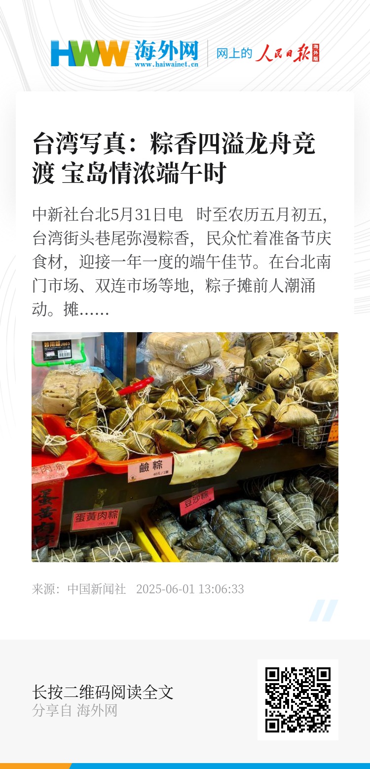 “我最喜欢小时候家里长辈包的湖州粽,软糯咸香,那是一种回不去的味道。”在台北南门市场“立家湖州粽”前排队的张先生感慨道。如今台湾不少家庭已不再自己动手包粽子,但节日里吃到熟悉的滋味,便是与过往温情的重逢。“重要的不是谁来包,而是有没有那份心,吃粽子是一种记忆的延续。”张先生说。