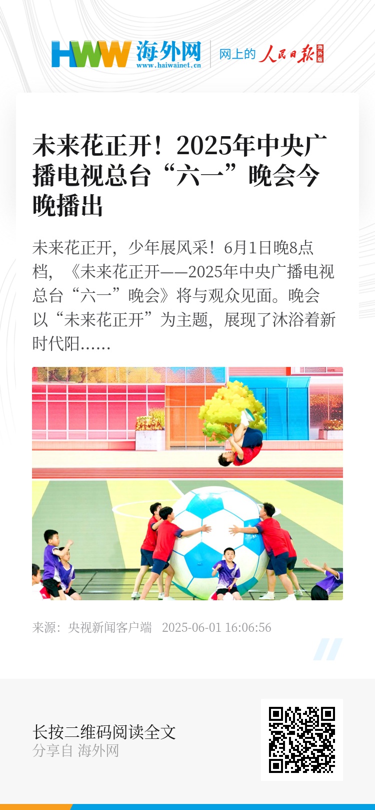 《未来花正开——2025年中央广播电视总台“六一”晚会》将于6月1日晚8点档,在综合频道(CCTV-1)、少儿频道(CCTV-14)、央视频、央视网、央视少儿客户端同步播出。