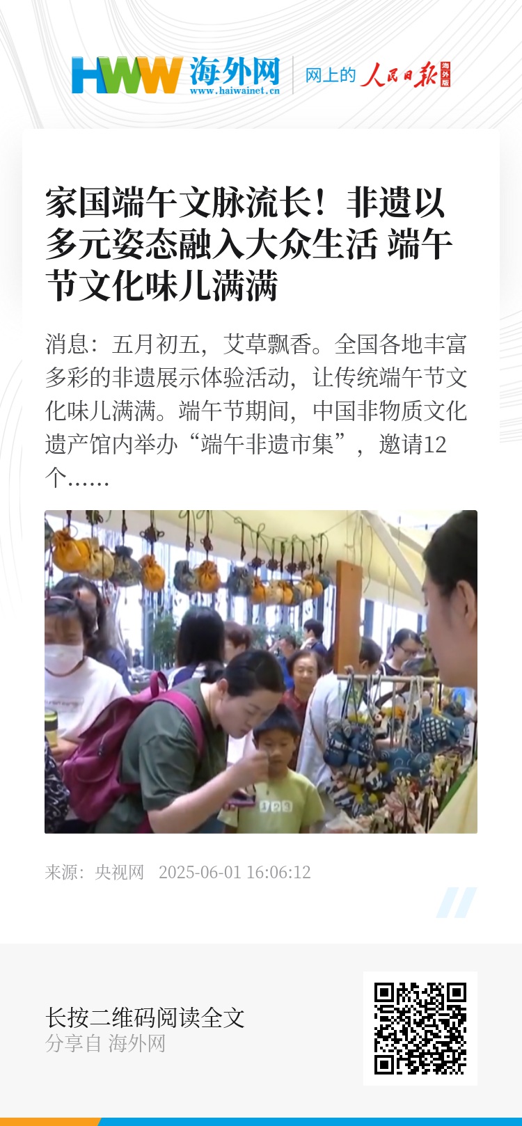 央视网消息:五月初五,艾草飘香。全国各地丰富多彩的非遗展示体验活动,让传统端午节文化味儿满满。
