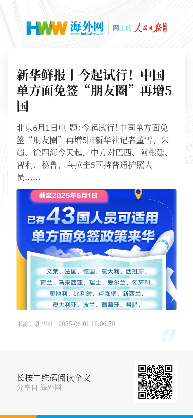 新华社北京6月1日电 题:今起试行!中国单方面免签“朋友圈”再增5国