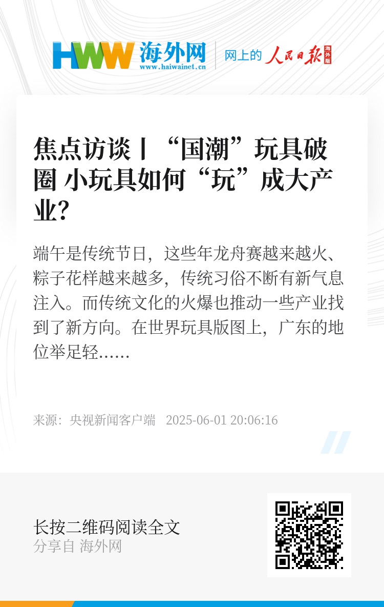 端午是传统节日,这些年龙舟赛越来越火、粽子花样越来越多,传统习俗不断有新气息注入。而传统文化的火爆也推动一些产业找到了新方向。在世界玩具版图上,广东的地位举足轻重。这里不仅是中国最大的玩具生产基地,更是全球玩具产业不可或缺的一环。其中,汕头是以针对低龄儿童的玩具闻名遐迩,而东莞则凭借潮玩脱颖而出。近年来,随着国潮文化的流行,广东玩具也抓住机遇,在这个领域大力挖潜。传统文化与现代设计双向奔赴,国潮玩具成了市场上的热门产品,备受追捧。