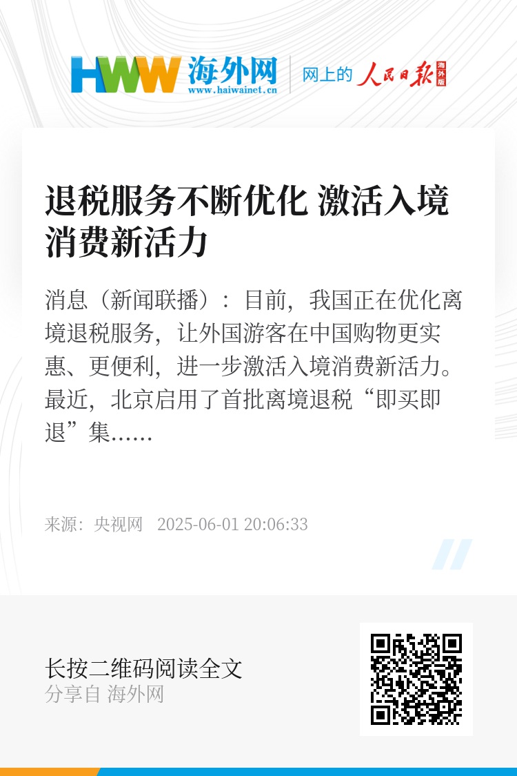 央视网消息(新闻联播):目前,我国正在优化离境退税服务,让外国游客在中国购物更实惠、更便利,进一步激活入境消费新活力。