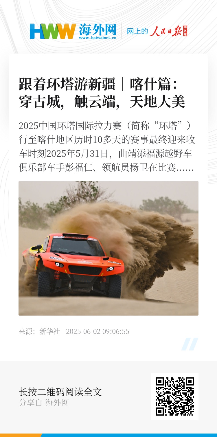 2025年5月31日,曲靖添福源越野车俱乐部车手彭福仁、领航员杨卫在比赛中。当日,2025中国环塔国际拉力赛第九赛段在新疆喀什地区麦盖提县的沙漠中进行。新华社记者 辛悦卫 摄