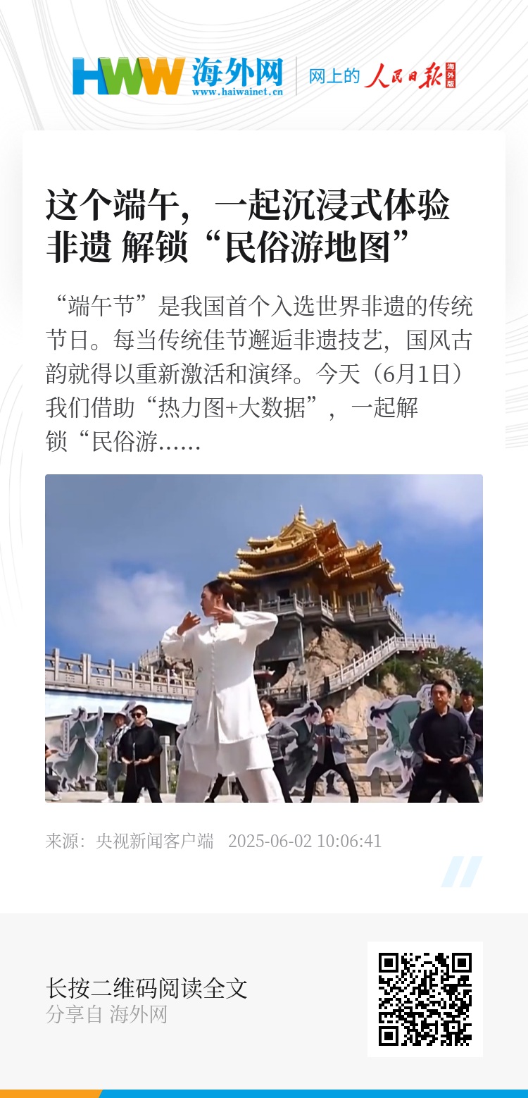 “端午节”是我国首个入选世界非遗的传统节日。每当传统佳节邂逅非遗技艺,国风古韵就得以重新激活和演绎。今天(6月1日)我们借助“热力图+大数据”,一起解锁“民俗游地图”。看看今年端午,非遗体验游究竟有多火?又有哪些城市成为民俗体验的热门打卡地?