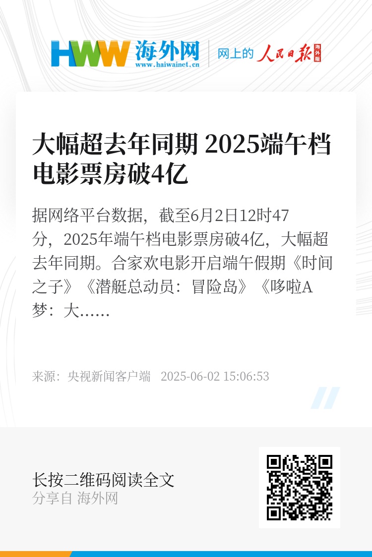 据网络平台数据,截至6月2日12时47分,2025年端午档电影票房破4亿,大幅超去年同期。