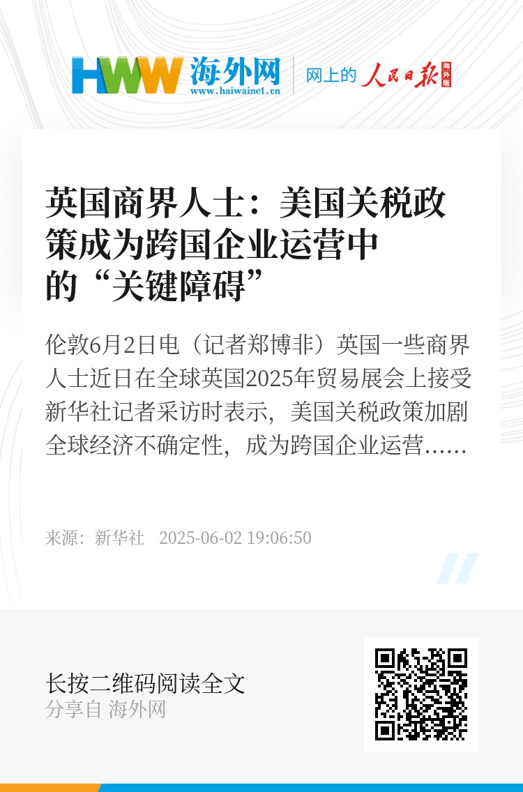 新华社伦敦6月2日电(记者郑博非)英国一些商界人士近日在全球英国2025年贸易展会上接受新华社记者采访时表示,美国关税政策加剧全球经济不确定性,成为跨国企业运营中的“关键障碍”。